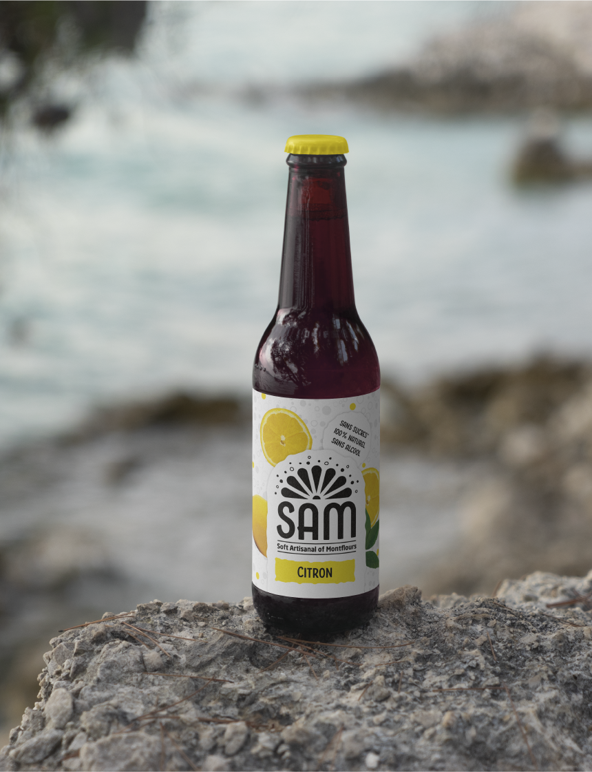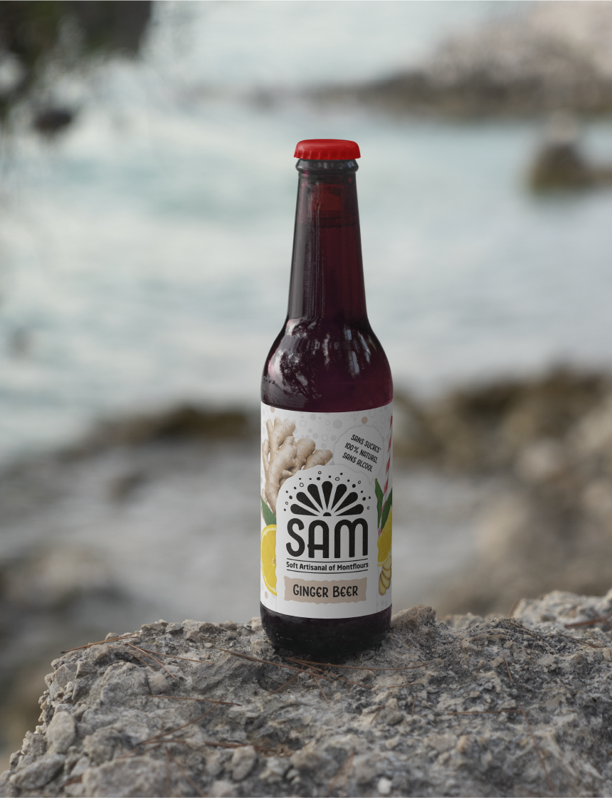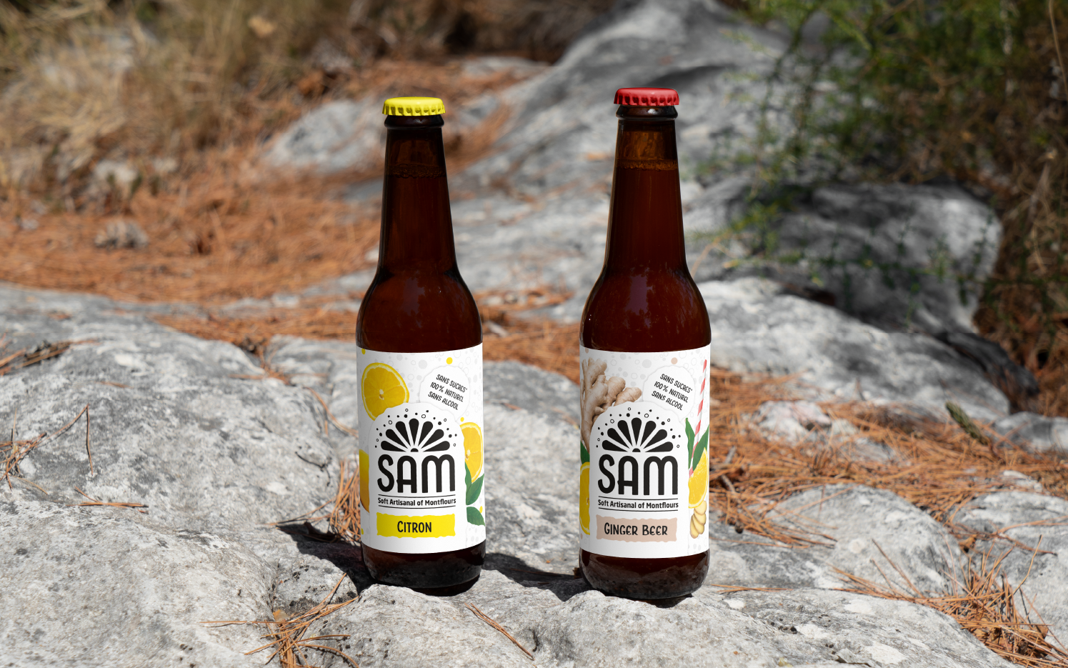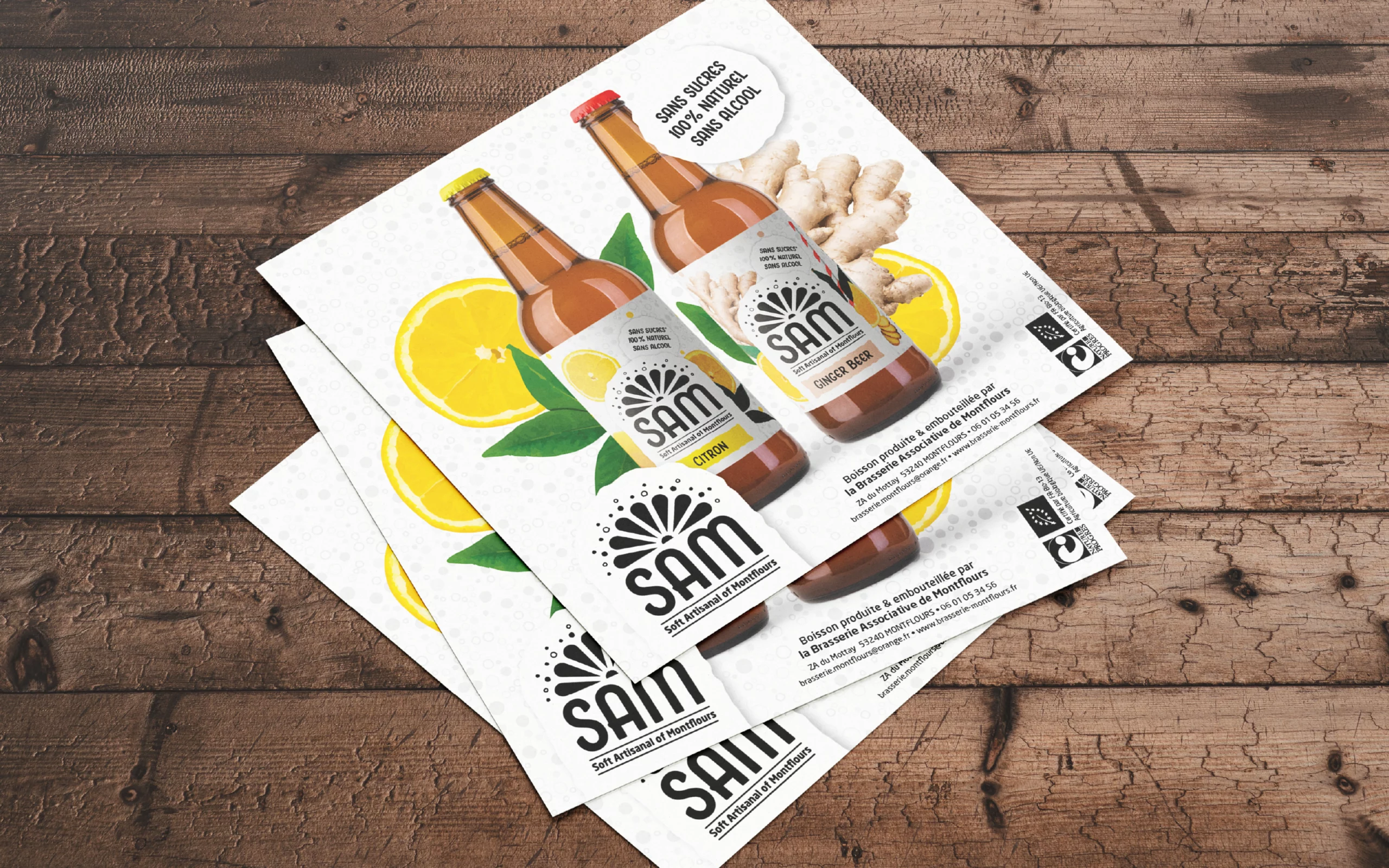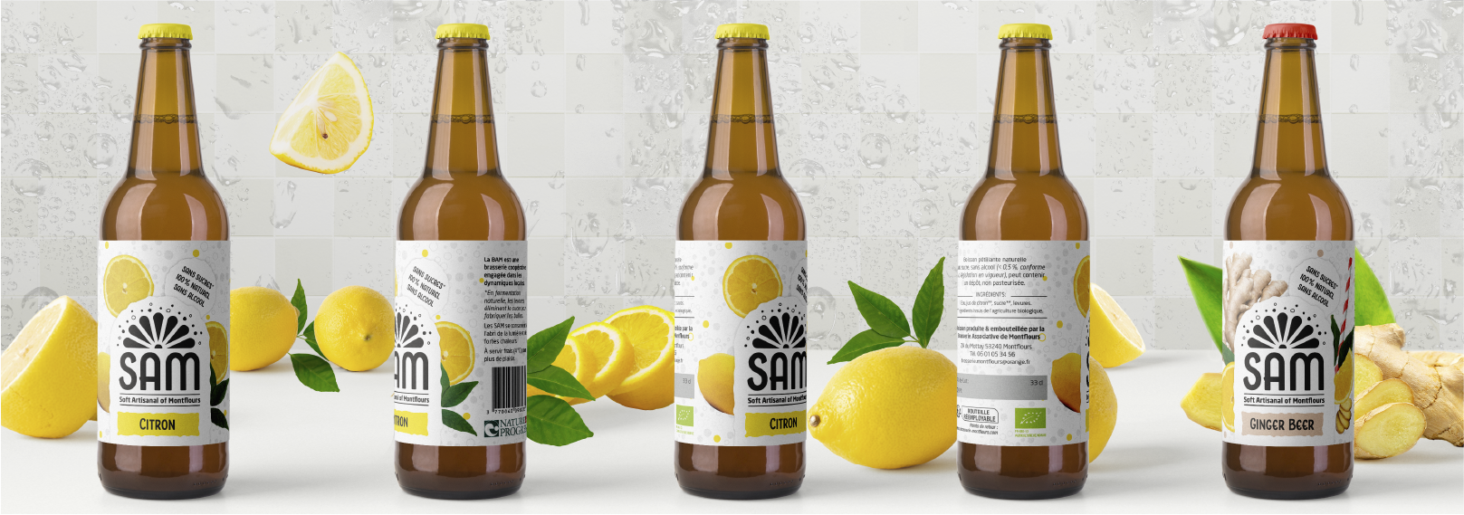 Création de l’identité visuelle et des étiquettes de la gamme de boissons artisanales SAM, une marque rafraîchissante et sans alcool, née à Montflours.